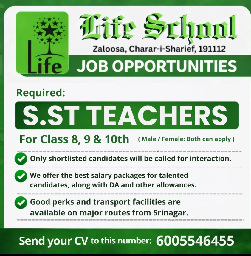 Additional Keywords: Teaching jobs Charar-i-Sharief, SST teacher jobs Kashmir, school teacher jobs Budgam, Life School jobs 2026, teaching vacancies Kashmir.